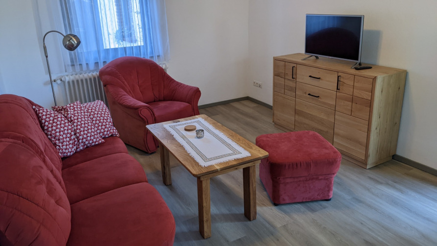 Über den gemütlich eingerichteten Wohnraum mit TV und Radio gelangt man auf die Terrasse.