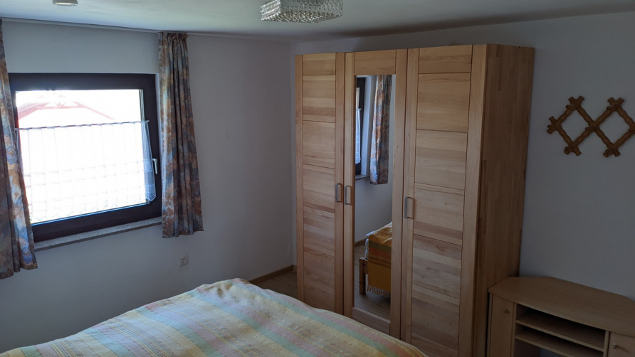 Ein großes Schlafzimmer mit Doppelbett (160 x 200) befinden sich um Obergeschoß. In dieses Schlafzimmer kann ein vorhandenes Kinderbett hinzugestellt werden.